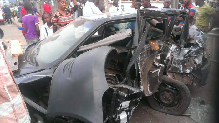 The Camry with registration number LSR-724-FW, reportedly lost a tyre while on top speed, ramned into a man washing his tricycle and somersaulted into a ditch.