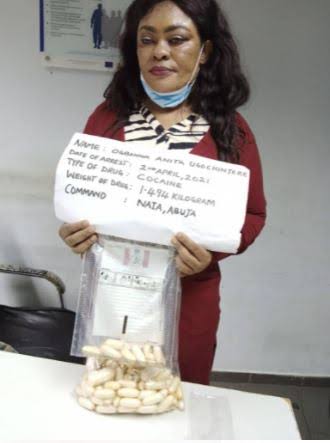 The suspect ,Mrs Anita Ugochinyere Ogbonna was arrested on arrival at the Nnamdi Azikiwe International Airport Abuja via a Qatar air from Sao Paulo Brazil through Doha