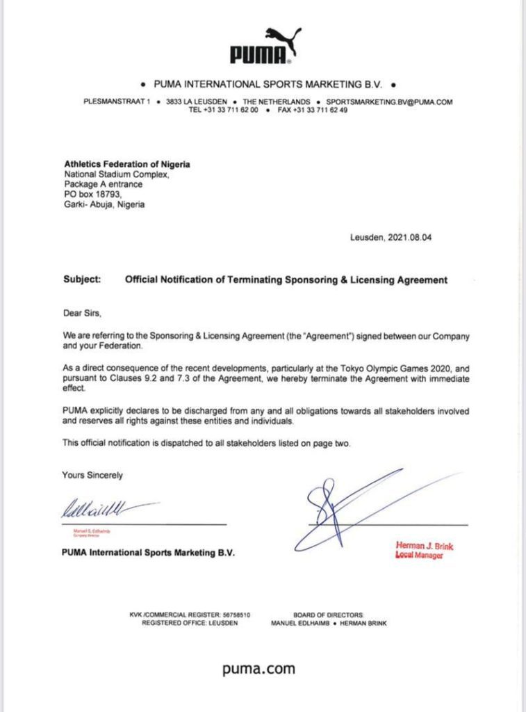 PUMA has terminated $2.67 million sponsorship and licencing contract agreement with the Athletics Federation of Nigeria AFN.