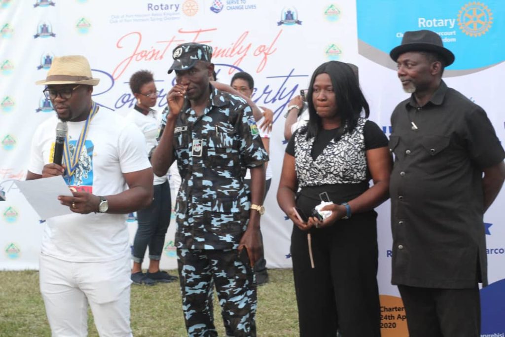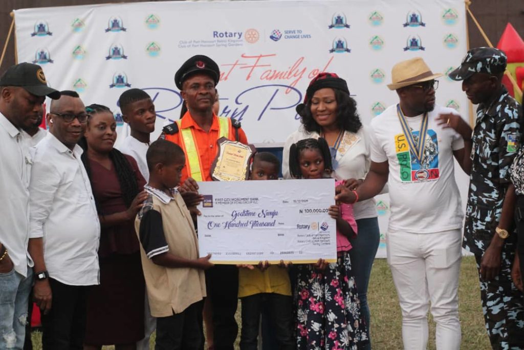 Our correspondent Precious Ahiakwo-Ovie reports that the President of Rotary Club of Port Harcourt Spring Gardens Ajoke Enebeli presented a cash token of one hundred thousand naira donated by both clubs to the Police Sergeant Warden Godstime Nwuju and his family.
