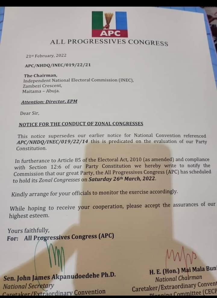 According to a letter addressed and sent to the Chairman of the Independent National Electoral Commission INEC signed by the Chairman Caretaker Extraordinary Convention Planning Commitee CECPC, Governor Mai Mala Buni and Secretary, Senator James Akpanudodehe, activities will begin on February 24 with publication of Zonal commitees, Meeting of Stakeholders will hold on February 26 while sale of forms for Zonal offices is scheduled for February 28 till March 3.