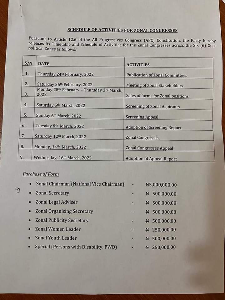 The All Progressives Congress APC has released its timetable and schedule of activities for Zonal Congresses.