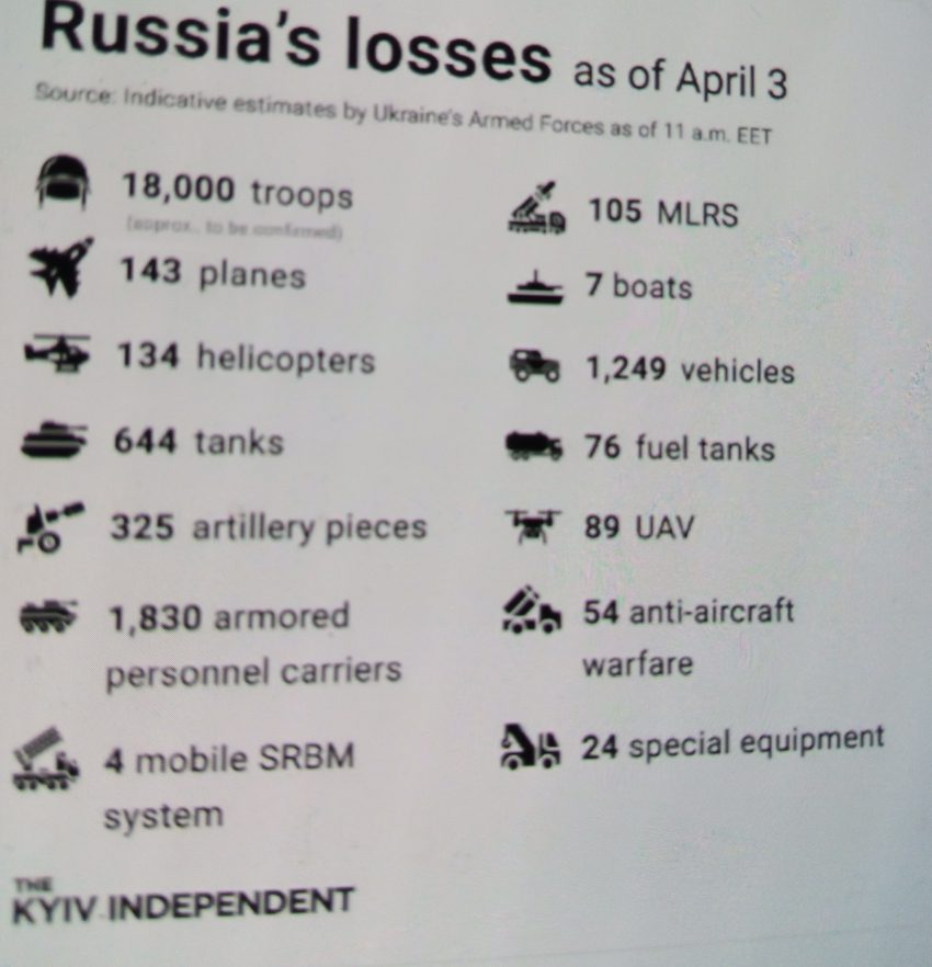 According to the Kyiv Independent,a Ukrainian media outlet, Russia has so far lost a total of 18,000 troops,143 planes and 134 Helicopters in its invasion of Ukraine which began in the morning of 24th February, 2022.
