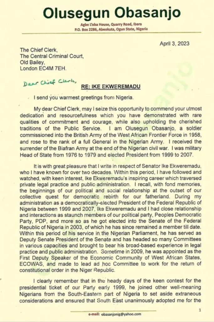 Nigeria’s former President,Chief Olusegun Obasanjo has written a letter of appeal to the court in the United Kingdom handling the Organ Harvesting case involving the Former Deputy Senate President,Ike Ekweremadu and his wife, Beatrice.