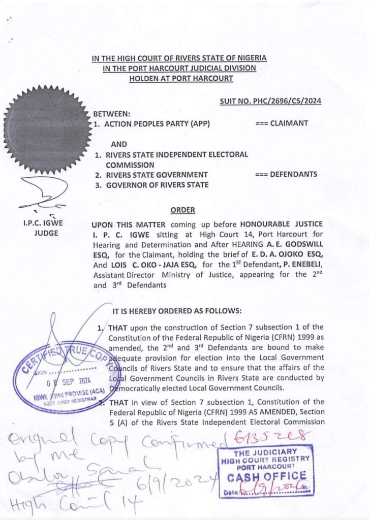 The court, presided over by Justice I. P. C. Igwe, in Port Hatcourt, gave the order in its final judgment on the matter in SUIT NO. PHC/2696/CS/2024, between the Action Peoples Party (APP) as claimant, and the Rivers State Independent Electoral Commission (RSIEC), Rivers State Government and Governor of Rivers State as defendants.