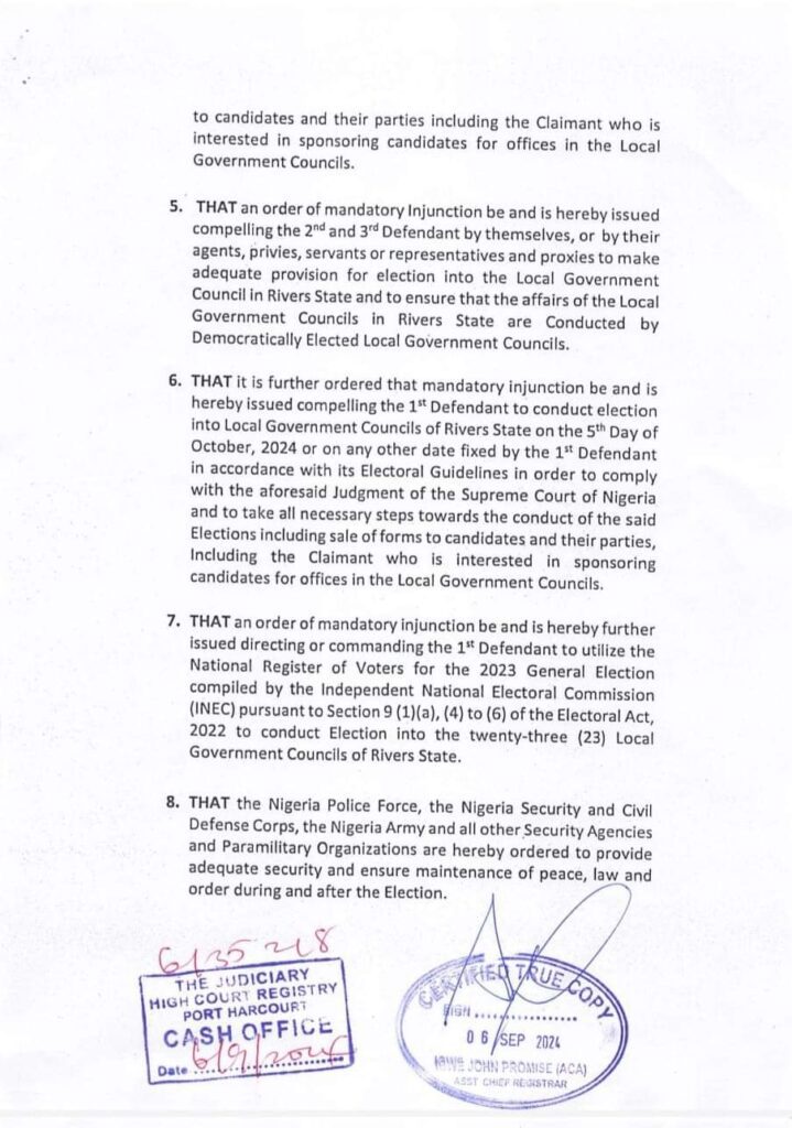 “That it is further ordered that mandatory injunction be and is hereby issued compelling the 1st Defendant to conduct election into Local Government Councils of Rivers State on the 5th Day of October, 2024 or on any other date fixed by the 1st Defendant in accordance with its Electoral Guidelines in order to comply with the aforesaid Judgment of the Supreme Court of Nigeria and to take all necessary steps towards the conduct of the said Elections including sale of forms to candidates and their parties, Including the Claimant who is interested in sponsoring candidates for offices in the Local Government Councils.
