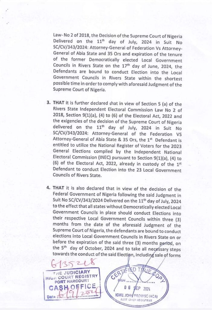 “That it is also declared that in view of the decision of the Federal Government of Nigeria following the said Judgment in Suit No SC/CV/343/2024 Delivered on the 11th day of July, 2024 to the effect that all states without Democratically elected Local Government Councils in place should conduct Elections into their respective Local Government Councils within three (3) months from the date of the aforesaid Judgment of the Supreme Court of Nigeria, the defendants are bound to conduct elections into Local Government Councils in Rivers State on or before the expiration of the said three (3) months period, on the 5th day of October, 2024 and to take all necessary steps towards the conduct of the said Election, including sale of forms to candidates and their parties including the Claimant who is interested in sponsoring candidates for offices in the Local Government Councils”.